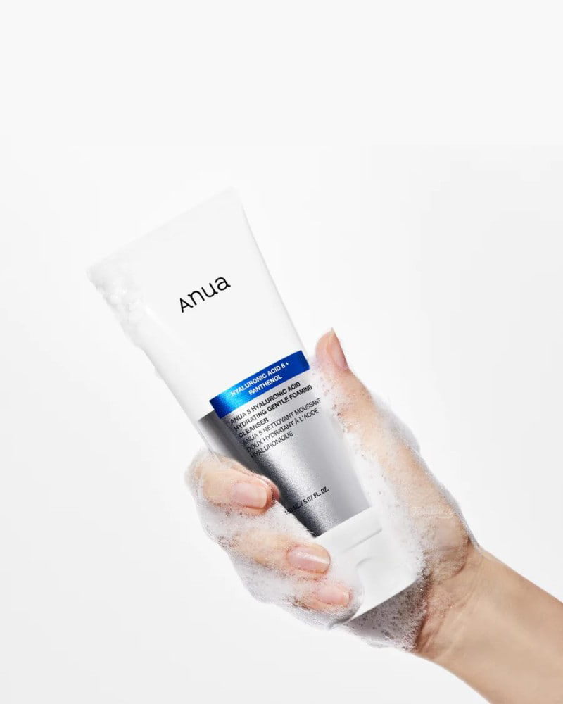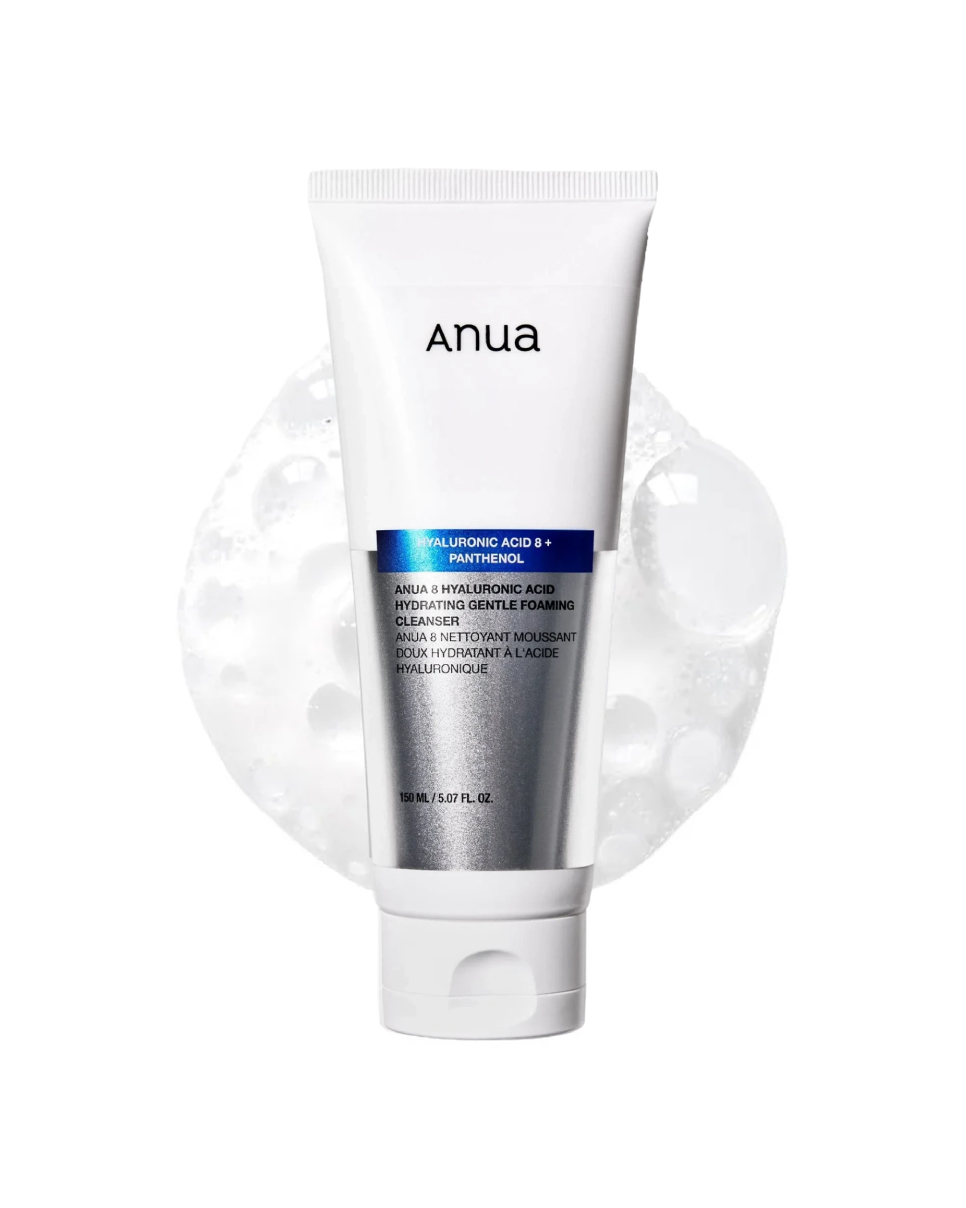 Anua 8 Hyaluronic Acid Hydrating Gentle Foaming Cleanser curăță delicat excesul de sebum, praful, celulele moarte și urmele de machiaj, lăsând pielea proaspătă și curată, fără senzație de uscăciune sau de strângere. Textura sa cremoasă se transformă într-o spumă bogată în contact cu apa, curățând blând și menținând echilibrul natural al pielii.