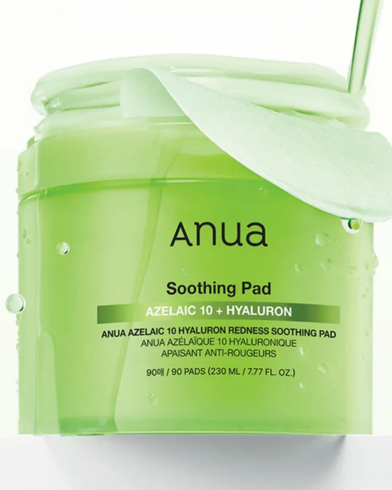 Discurile cu acid azelaic Anua Azelaic Acid 10 Hyaluron Redness Soothing Pad uniformizează tonul pielii, reduc roșeața și oferă un aspect luminos și sănătos. Ajută la diminuarea hiperpigmentării postinflamatorii, a urmelor postacneice și a rețelei vasculare vizibile de pe obraji, zona nasului și bărbie.