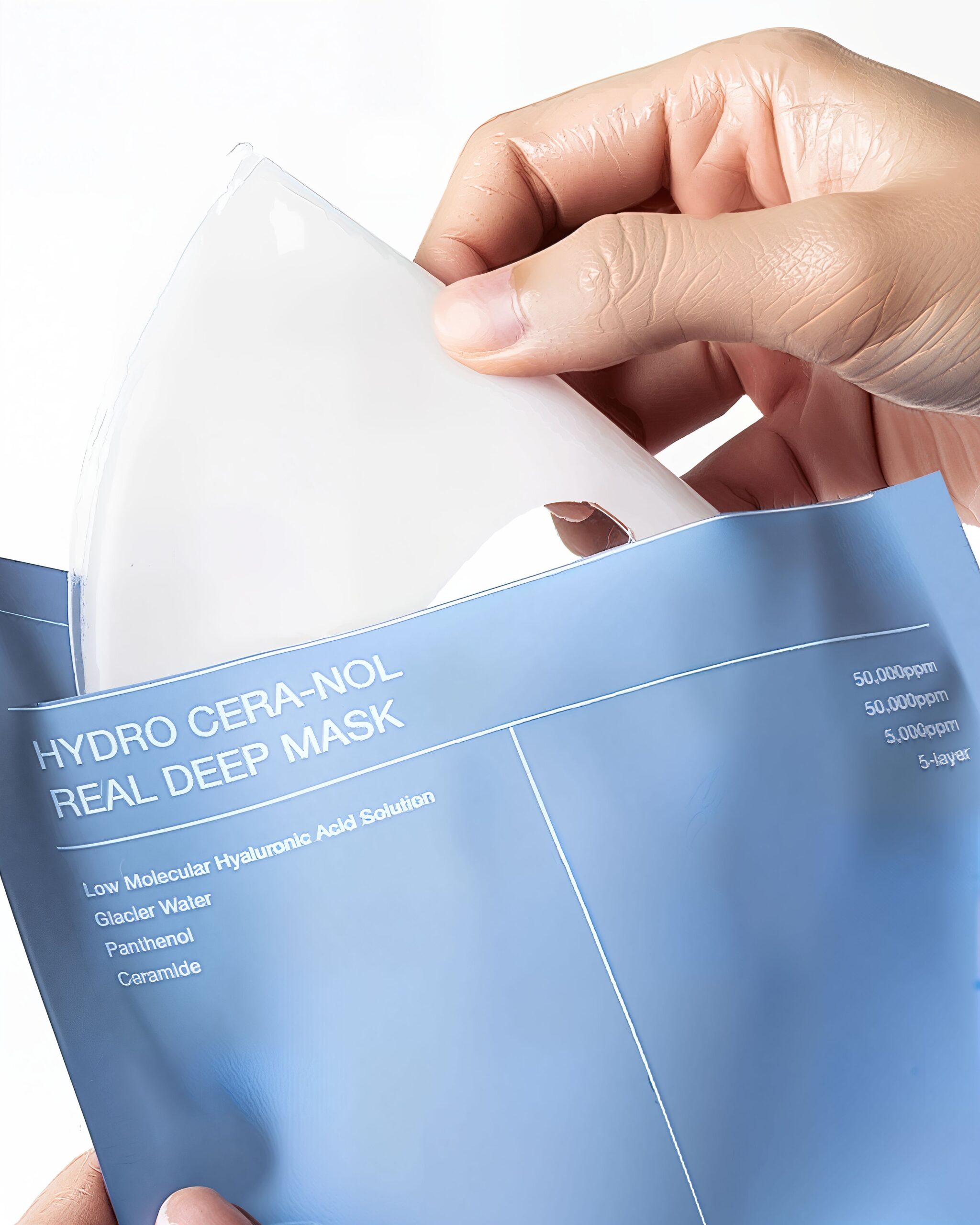 - După curățare, tonifiere și aplicarea serului, îndepărtați stratul protector al măștii și aplicați ambele părți pe față.