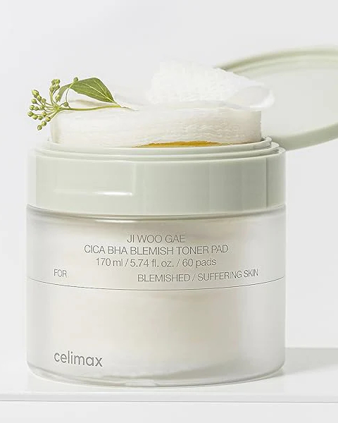 Celimax Ji Woo Gae Cica BHA Blemish Toner Pad – Dischete tonifiante pentru exfoliere și îngrijirea pielii cu imperfecțiuni