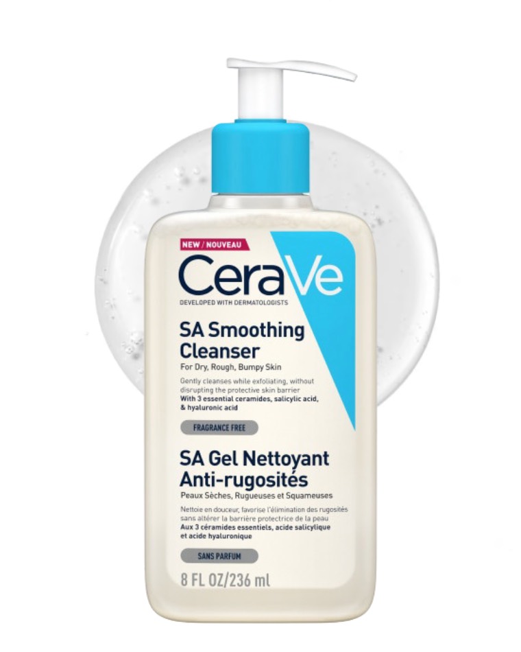 CeraVe SA Gel de curățare anti-rugozități – Este un produs de curățare delicat, creat pentru a îndepărta impuritățile și celulele moarte, contribuind la netezirea pielii cu textură neuniformă, fără a compromite bariera naturală de protecție.