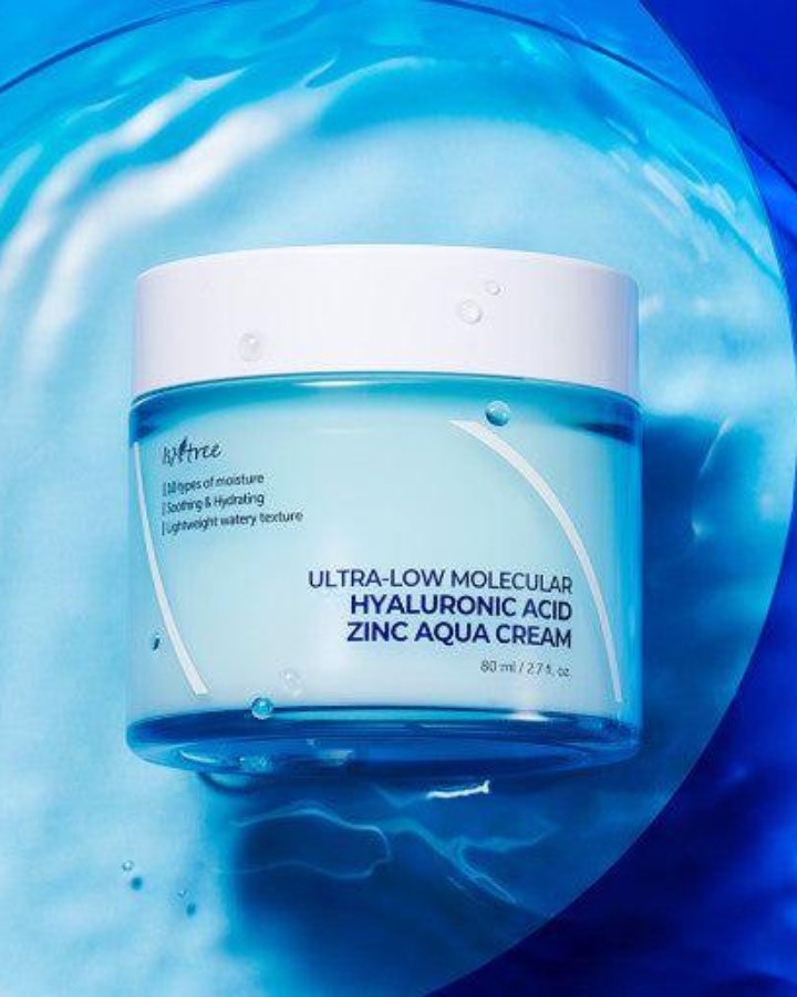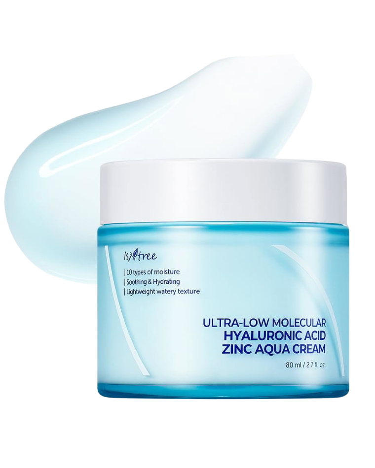 Увлажняющий крем IsNtree Ultra-low Molecular Hyaluronic Acid Zinc Aqua Cream — помогает сужать поры, успокаивает раздражённую кожу и снижает её температуру, уменьшая ощущение зуда и покраснение.