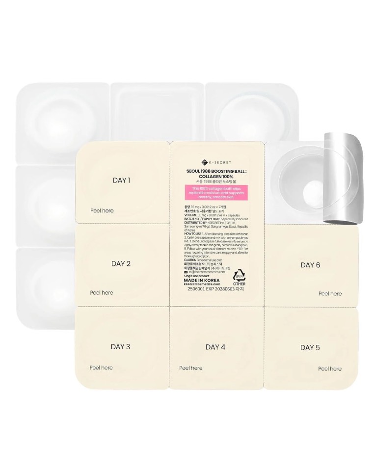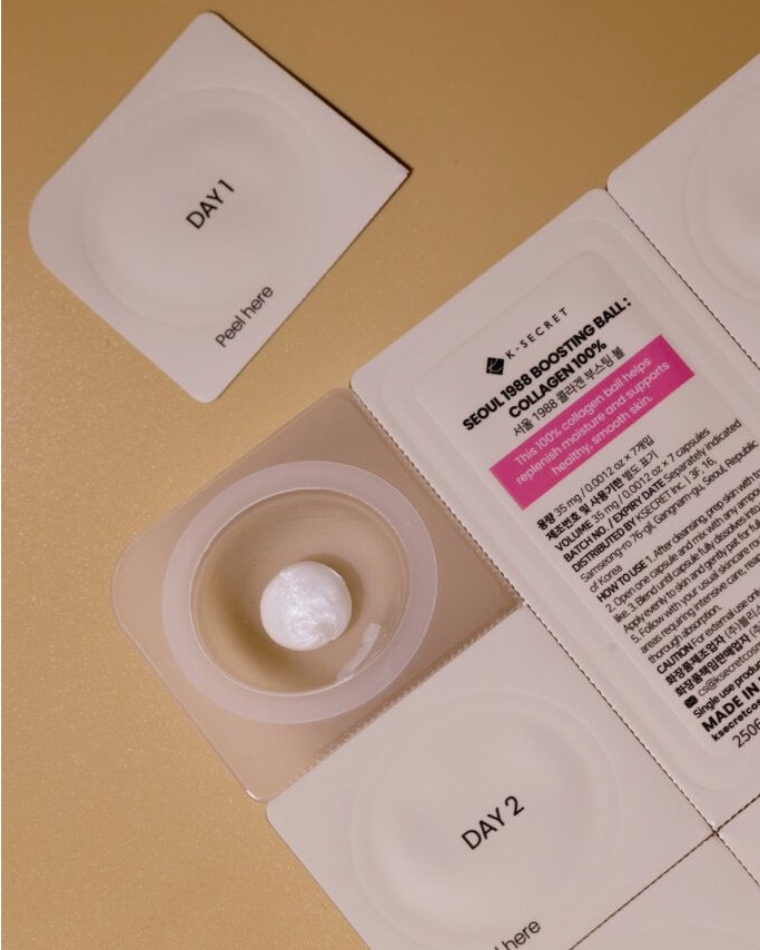 K-SECRET – SEOUL 1988 Boosting Ball : Collagen 100% — твёрдый бустер с чистым коллагеном, созданный для усиления эффективности ухода и придания коже дополнительной упругости, эластичности и гладкости