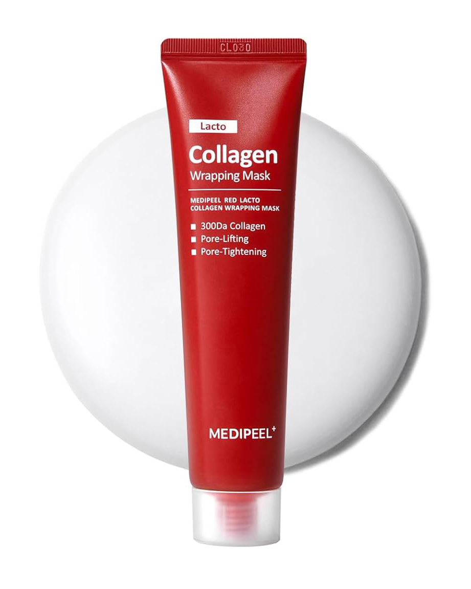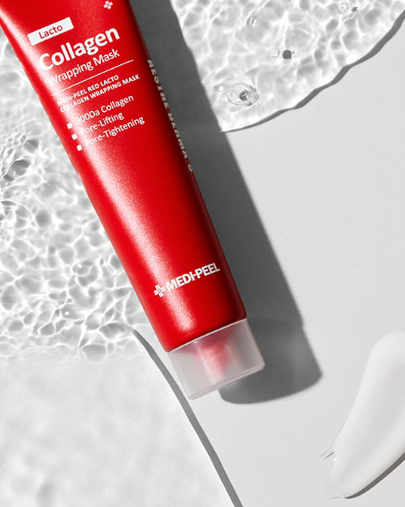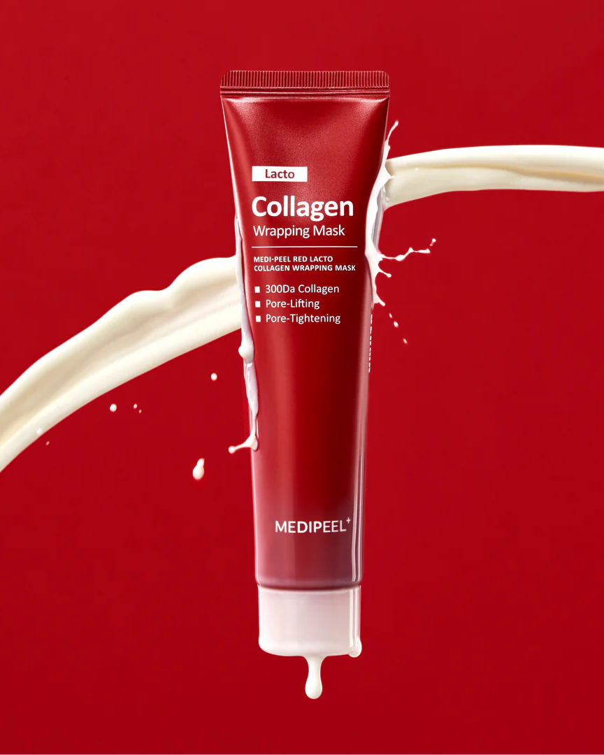 MEDIPEEL Red Lacto Collagen Wrapping Mask este o mască-film inovatoare, formulată pentru a reduce dimensiunea porilor, îmbunătăți elasticitatea pielii și oferi un efect de lifting instantaneu. Textura sa gelificată formează o membrană de colagen respirabilă, care favorizează absorbția profundă a ingredientelor active și asigură un efect imediat de netezire și fermitate.